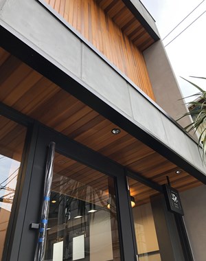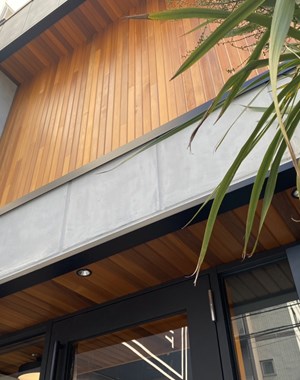 | 備 考 | 地域では有名なお肉屋さんの店舗での事例です。ウェスタンレッドシダーの本実サイディング 1 x 4 T&G Clear という高いグレードの木材を使い、その保護塗装にシッケンズをご使用頂きました。表面がラフなので2回塗りで十分高い耐候性を発揮します。レンガやガラス等の素材とマッチして木質感を活かした、自然でお洒落な仕上がりとなりました。ナチュラル色で明るい表情です。